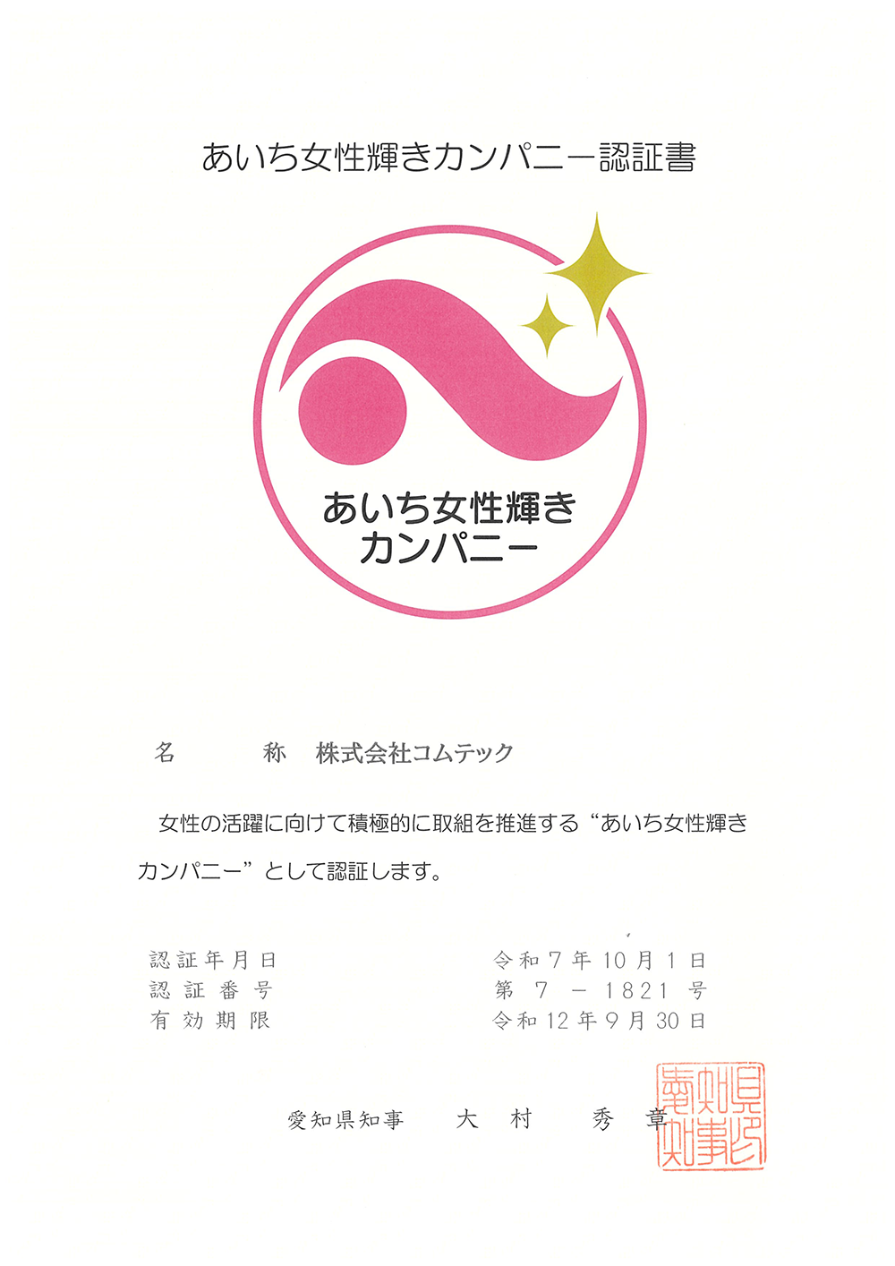 女性の活躍促進宣言をし、女性の活躍に向けて積極的に取組みを推進するあいち女性輝きカンパニーの認証を2025年10月に愛知県から受けました。